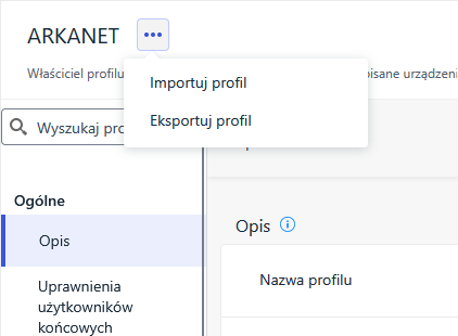 W lewym górnym rogu, obok nazwy profilu, znajduje się menu z trzema kropkami. Po jego rozwinięciu wybierz opcję eksportu profilu.