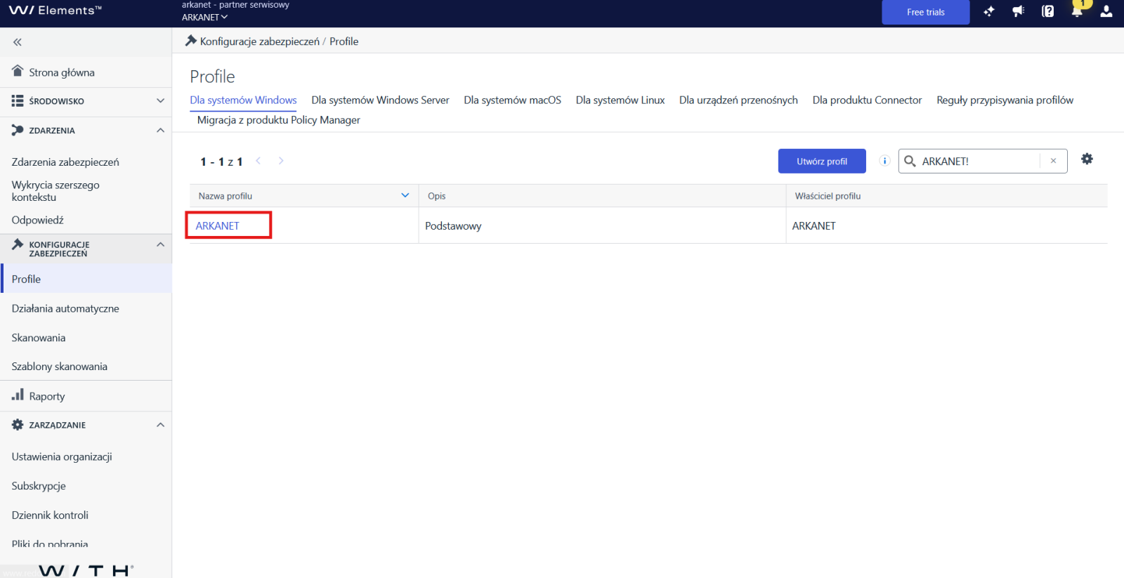 Konfiguracje zabezpieczeń → Profile